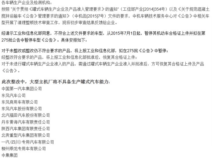 早在 2015年初中機(jī)車輛中機(jī)車輛服務(wù)中心出臺了“關(guān)于規(guī)范混凝土攪拌運輸車《公告》管理要求的通知”,規(guī)定要求于2015年7月1日正式執(zhí)行新標(biāo)準(zhǔn)。新標(biāo)準(zhǔn)中,4軸車型的攪拌筒的攪動容量需≤8立方米,3軸車型需≤6立方米,而2軸車型的則需≤4立方米”。日前,工信部發(fā)布了《關(guān)于反饋清理整頓審查結(jié)果及有關(guān)事項的通知》,通知內(nèi)容如下: